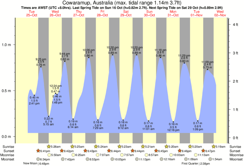 Tide Times are AWST (UTC +8.0hrs). Last Spring High Tide at Cowaramup was on Sun 07 Dec (height: 0.95m 3.1ft). Next high Spring Tide at Cowaramup will be on Mon 22 Dec (height: 0.96m 3.1ft).