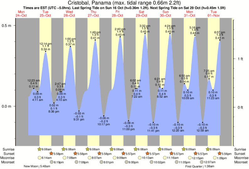 Tide Times are EST (UTC -5.0hrs). Last Spring High Tide at Cristobal was on Thu 18 Dec (height: 0.38m 1.2ft). Next high Spring Tide at Cristobal will be on Thu 01 Jan (height: 0.49m 1.6ft).
