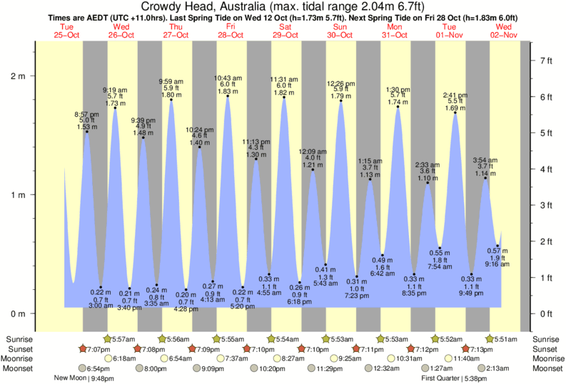 Tide Times are AEDT (UTC +11.0hrs). Last Spring High Tide at Crowdy Head was on Sat 06 Dec (height: 2.07m 6.8ft). Next high Spring Tide at Crowdy Head will be on Sun 21 Dec (height: 1.83m 6.0ft).