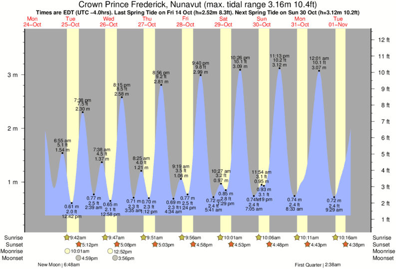Crown Prince Frederick tide chart key: The tide chart above shows the height and times of high tide and low tide for Crown Prince Frederick, Nunavut. The grey shading corresponds to nighttime hours between sunset and sunrise at Crown Prince Frederick.