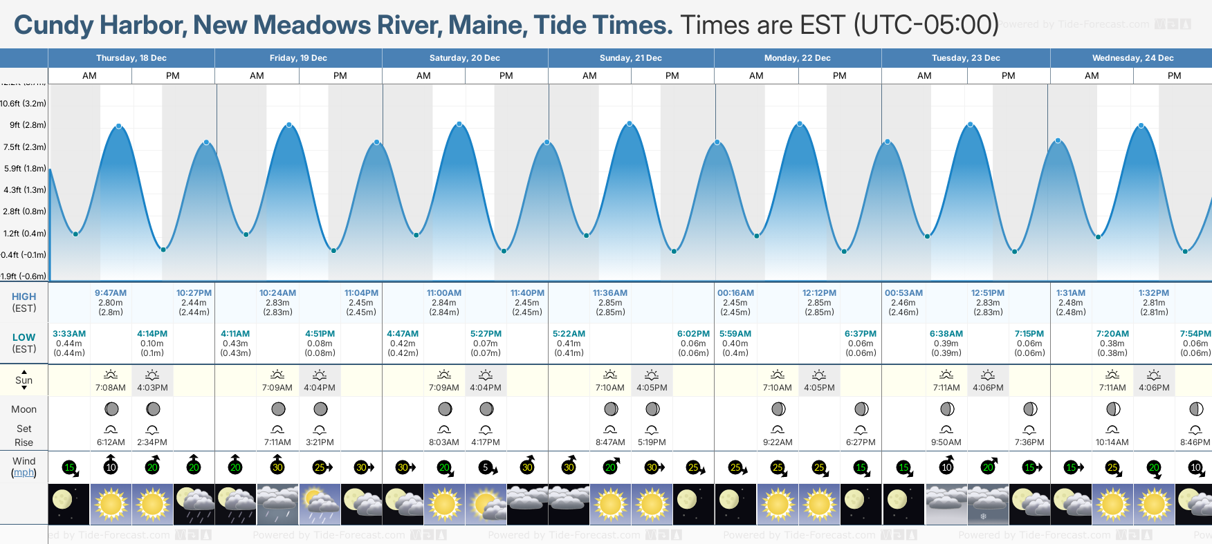 December and January Tide charts for Cundy Harbor, New Meadows River: The tide charts below show the height, time and date of high and low tides for the next 30 days.