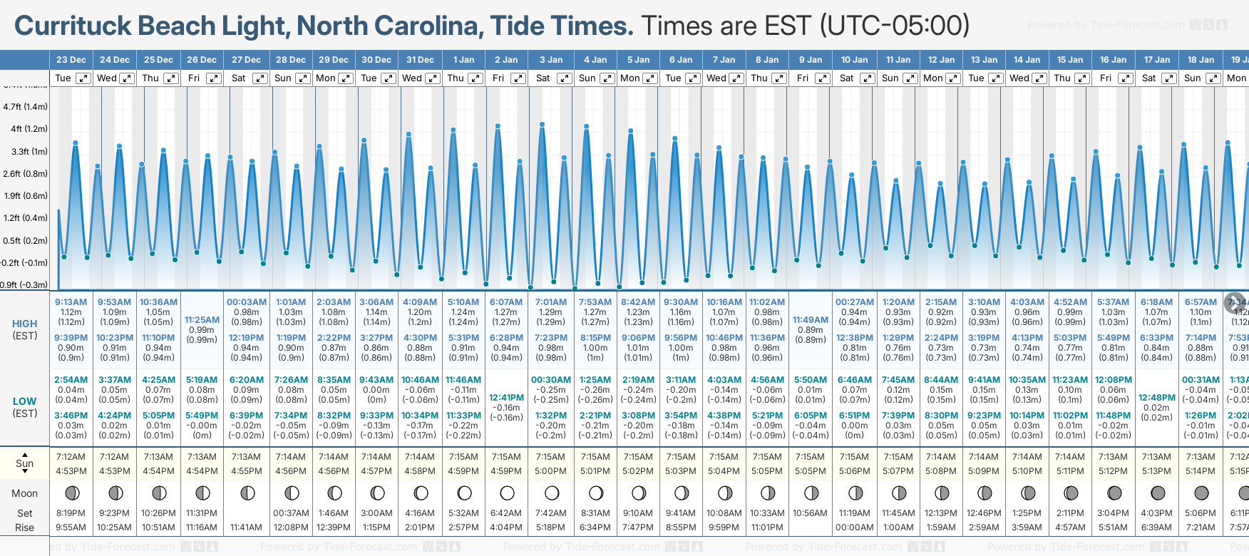 December and January Tide charts for Currituck Beach Light: The tide charts below show the height, time and date of high and low tides for the next 30 days.