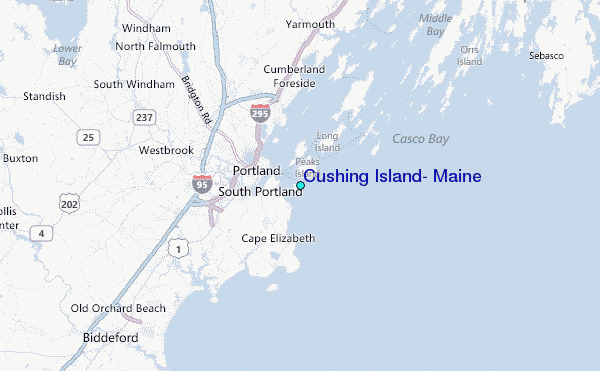 Use this relief map to navigate to tide stations, surf breaks and cities that are in the area of Cushing Island, Maine.