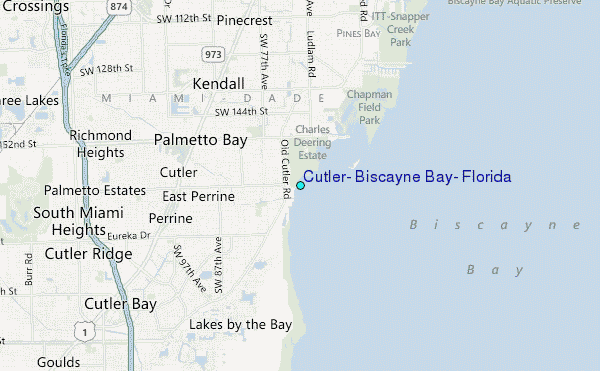 Use this relief map to navigate to tide stations, surf breaks and cities that are in the area of Cutler, Biscayne Bay, Florida.