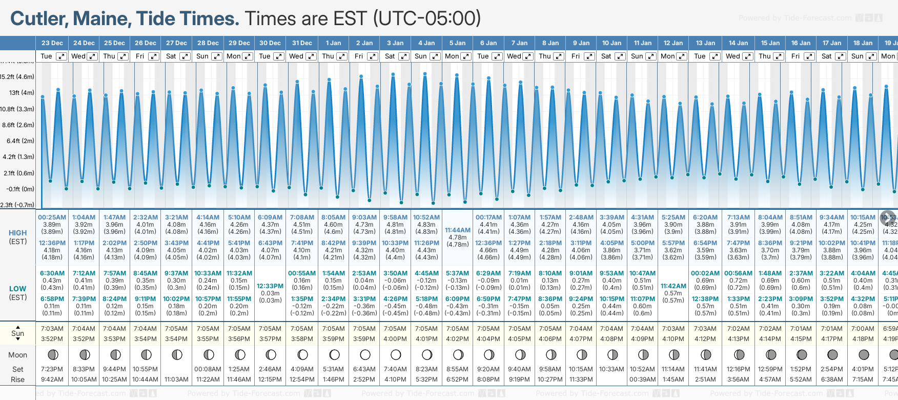 Tide Times are EST (UTC -5.0hrs). Last Spring High Tide at Cutler was on Sat 20 Dec (height: 4.21m 13.8ft). Next high Spring Tide at Cutler will be on Sun 04 Jan (height: 4.83m 15.8ft).