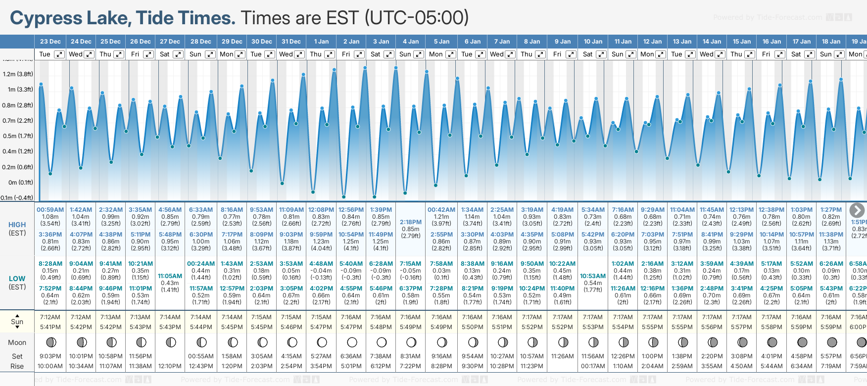 December and January Tide charts for Cypress Lake: The tide charts below show the height, time and date of high and low tides for the next 30 days.