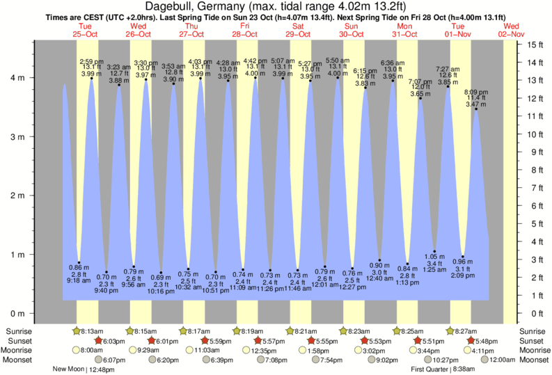 Tide Times are CET (UTC +1.0hrs). Last Spring High Tide at Dagebull was on Mon 08 Dec (height: 3.96m 13.0ft). Next high Spring Tide at Dagebull will be on Tue 23 Dec (height: 4.08m 13.4ft).