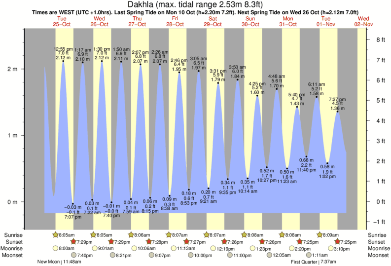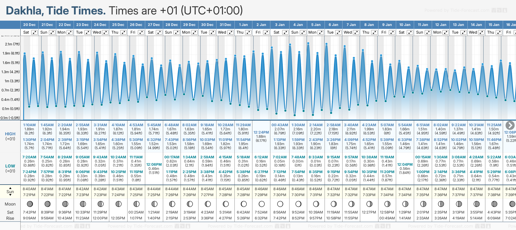 December and January Tide charts for Dakhla: The tide charts below show the height, time and date of high and low tides for the next 30 days.