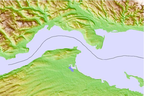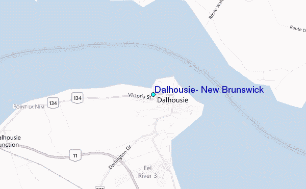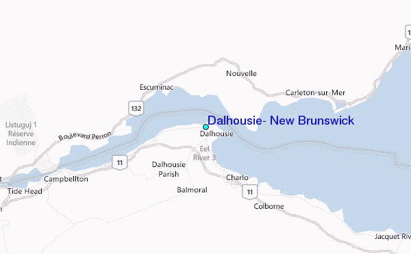 Use this relief map to navigate to tide stations, surf breaks and cities that are in the area of Dalhousie, New Brunswick.