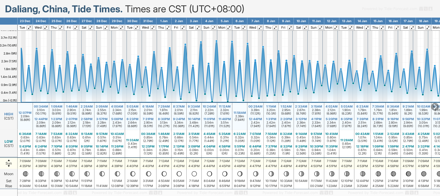 December and January Tide charts for Daliang: The tide charts below show the height, time and date of high and low tides for the next 30 days.