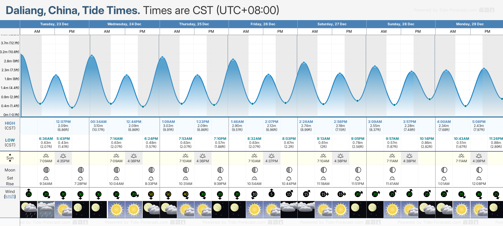 Tide Times are CST (UTC +8.0hrs). Last Spring High Tide at Daliang was on Mon 22 Dec (height: 3.14m 10.3ft). Next high Spring Tide at Daliang will be on Mon 05 Jan (height: 3.54m 11.6ft).