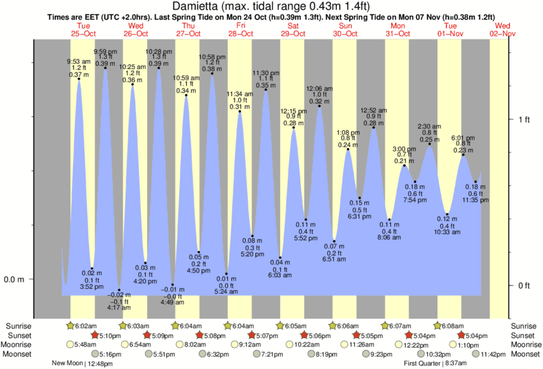 Tide Times are EET (UTC +2.0hrs). Last Spring High Tide at Damietta was on Sat 06 Dec (height: 0.38m 1.2ft). Next high Spring Tide at Damietta will be on Sun 21 Dec (height: 0.35m 1.1ft).