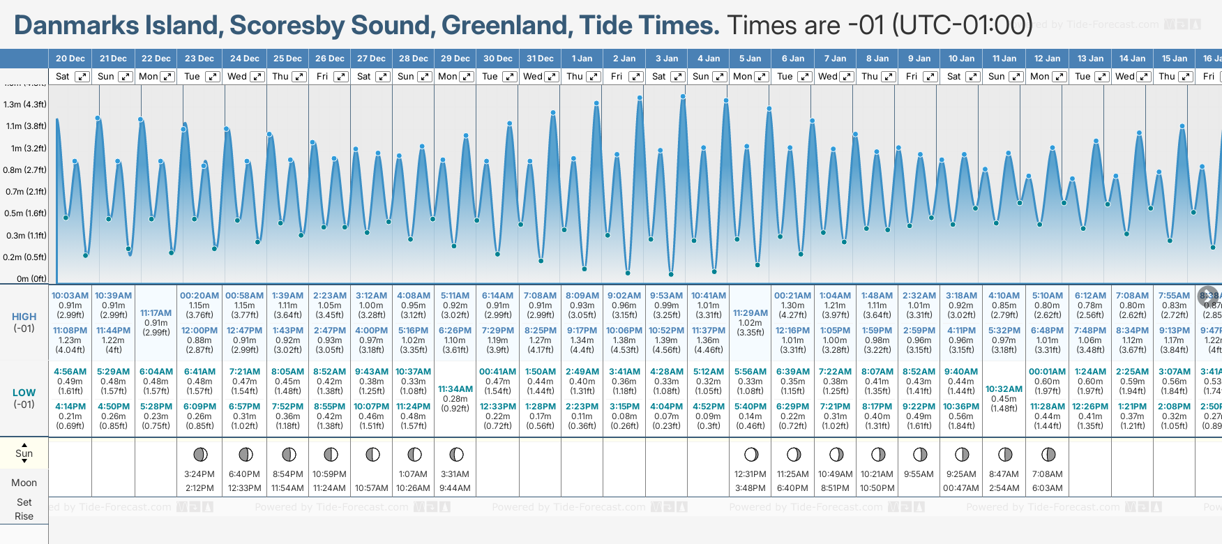 December and January Tide charts for Danmarks Island, Scoresby Sound: The tide charts below show the height, time and date of high and low tides for the next 30 days.