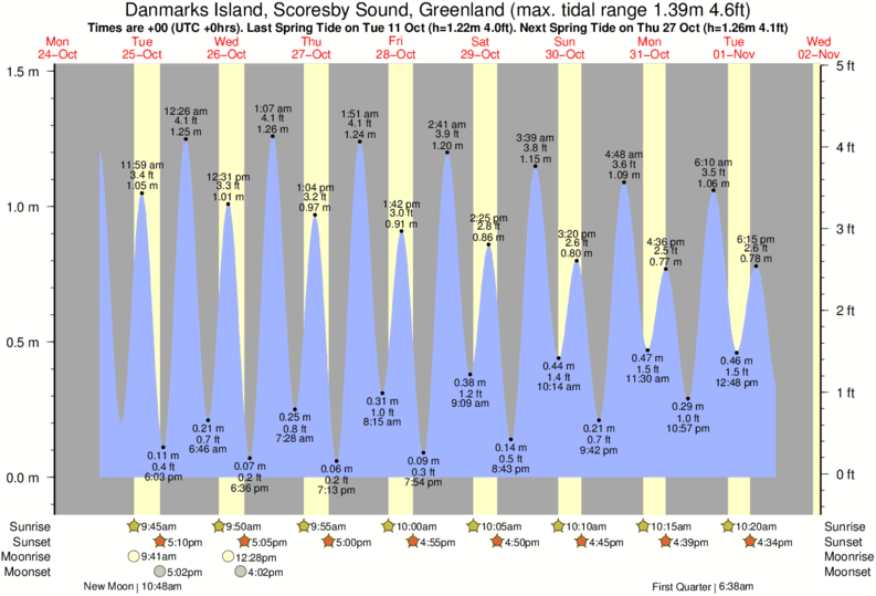Tide Times are -01 (UTC -1.0hrs). Last Spring High Tide at Danmarks Island, Scoresby Sound was on Fri 05 Dec (height: 1.40m 4.6ft). Next high Spring Tide at Danmarks Island, Scoresby Sound will be on Sat 20 Dec (height: 1.23m 4.0ft).