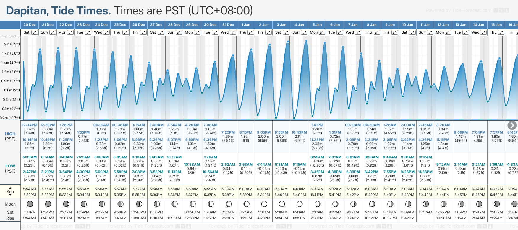 December and January Tide charts for Dapitan: The tide charts below show the height, time and date of high and low tides for the next 30 days.