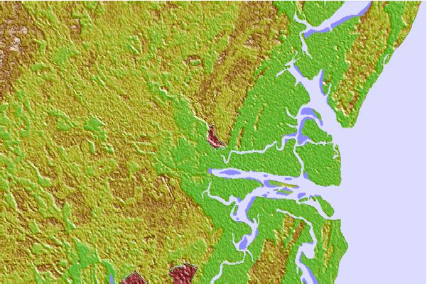 Use this relief map to navigate to tide stations, surf breaks and cities that are in the area of Darien, Darien River, Georgia.