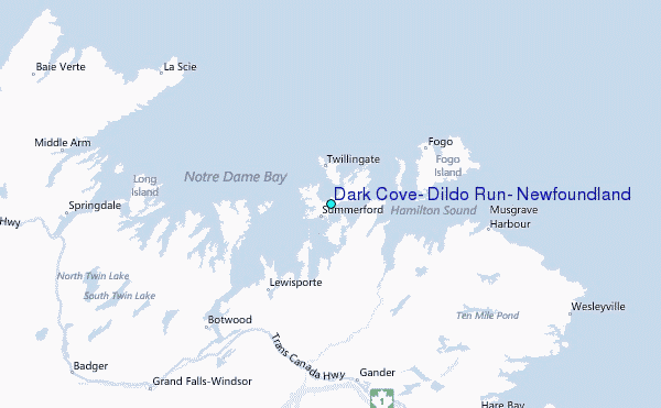 Use this relief map to navigate to tide stations, surf breaks and cities that are in the area of Dark Cove, Dildo Run, Newfoundland.