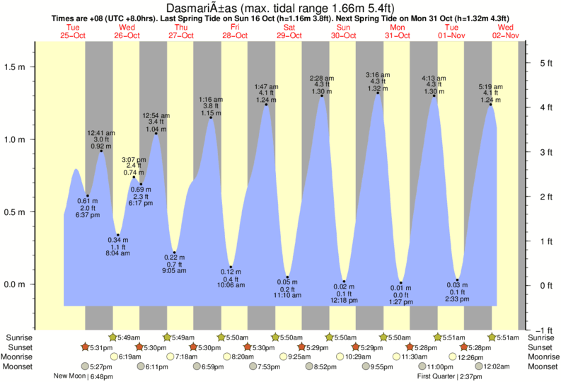 Tide Times are PST (UTC +8.0hrs). Last Spring High Tide at Dasmariñas was on Sun 07 Dec (height: 1.51m 5.0ft). Next high Spring Tide at Dasmariñas will be on Mon 22 Dec (height: 1.32m 4.3ft).