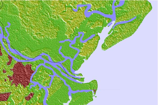 Use this relief map to navigate to tide stations, surf breaks and cities that are in the area of Daufuskie Landing, South Carolina.