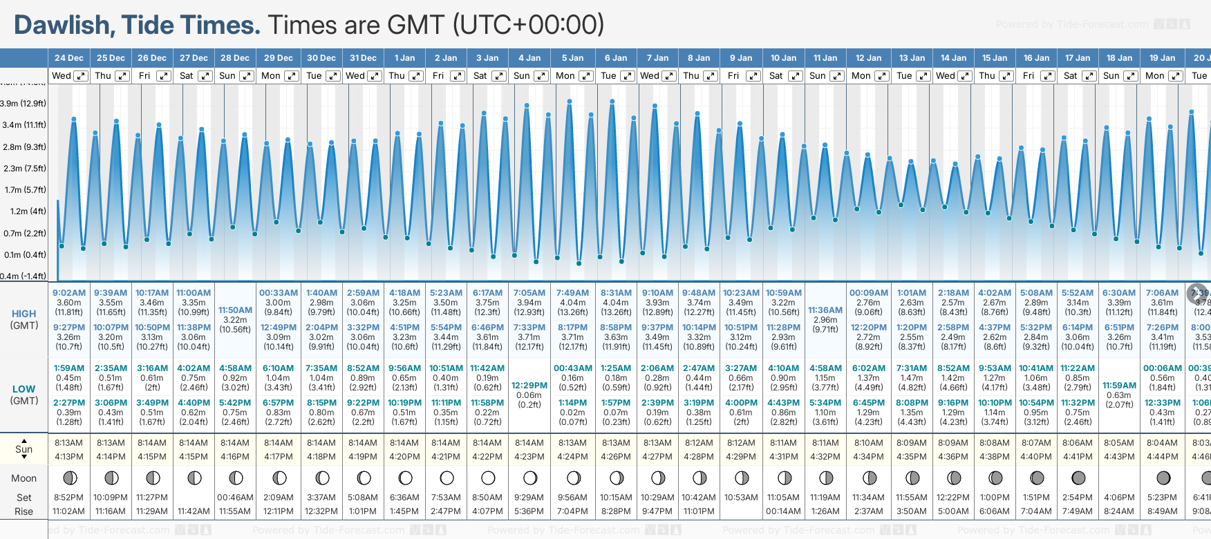 December and January Tide charts for Dawlish: The tide charts below show the height, time and date of high and low tides for the next 30 days.