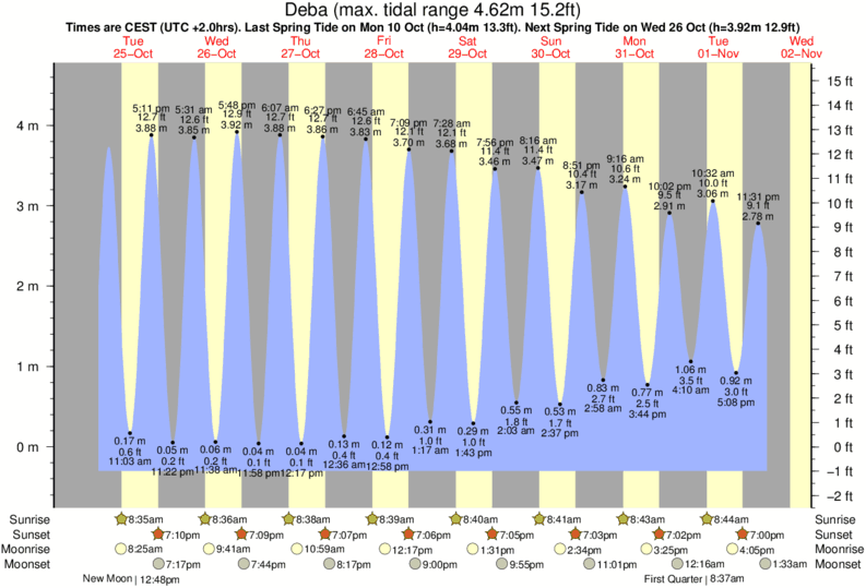 December and January Tide charts for Deba: The tide charts below show the height, time and date of high and low tides for the next 30 days.