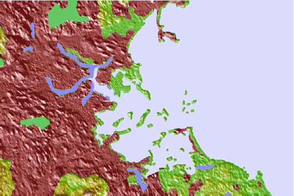 Use this relief map to navigate to tide stations, surf breaks and cities that are in the area of Deer Island (south end), Boston Harbor, Massachusetts.