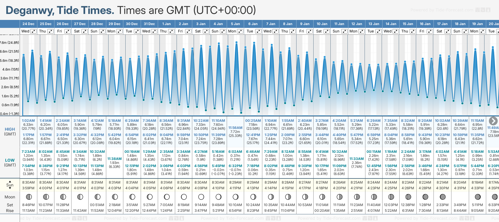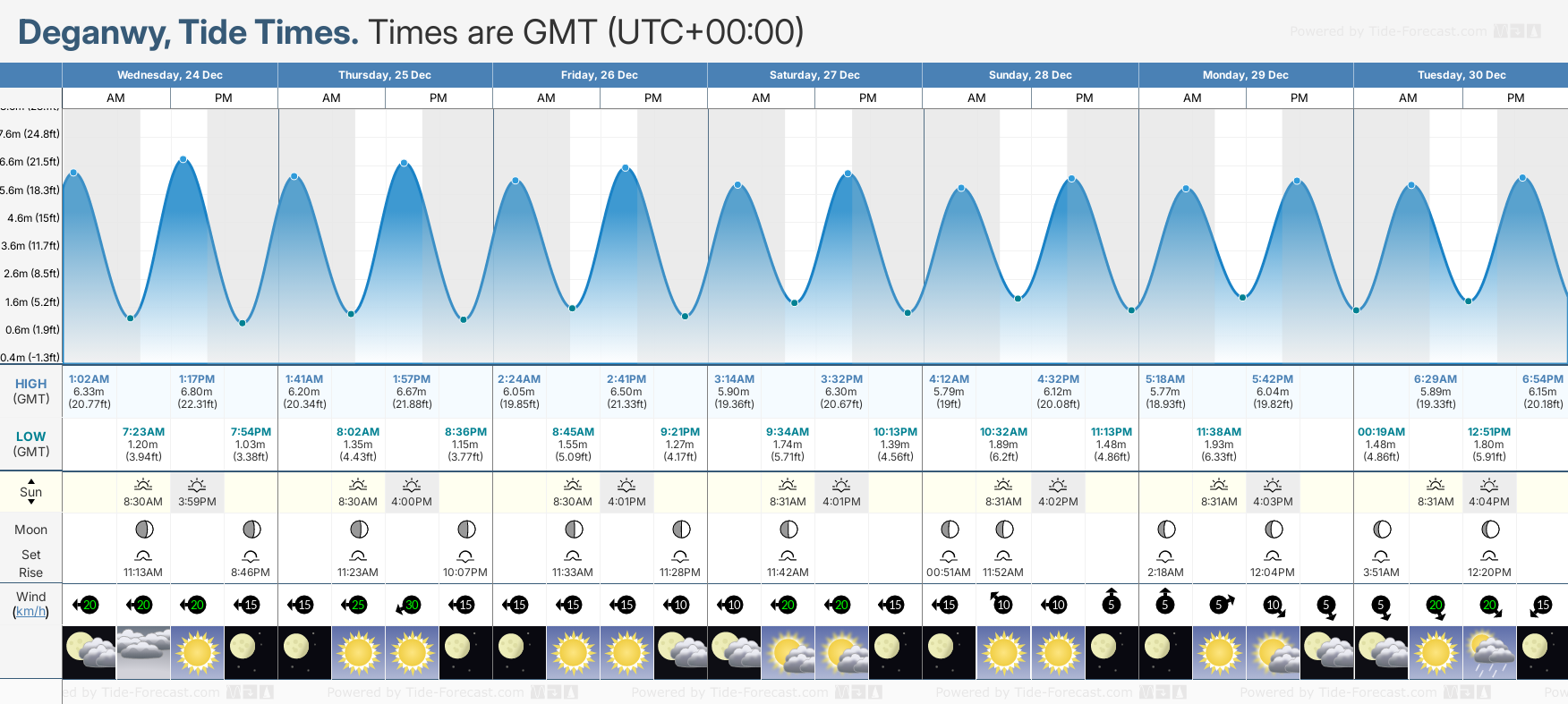 December and January Tide charts for Deganwy: The tide charts below show the height, time and date of high and low tides for the next 30 days.