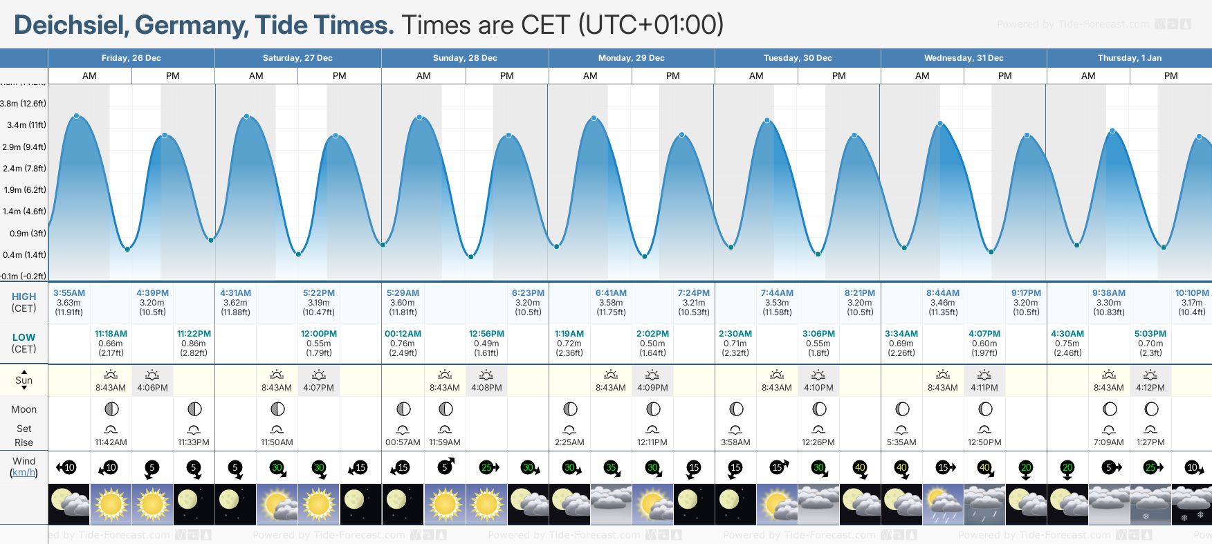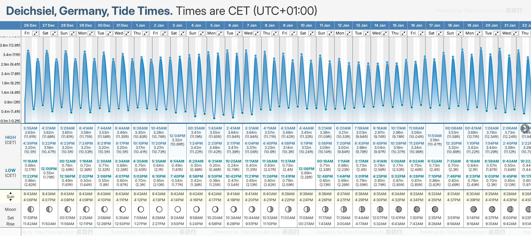 December and January Tide charts for Deichsiel: The tide charts below show the height, time and date of high and low tides for the next 30 days.