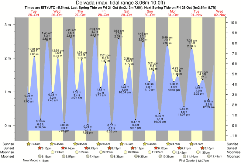 Tide Times are IST (UTC +5.5hrs). Last Spring High Tide at Delvada was on Sat 06 Dec (height: 2.98m 9.8ft). Next high Spring Tide at Delvada will be on Sun 21 Dec (height: 2.59m 8.5ft).