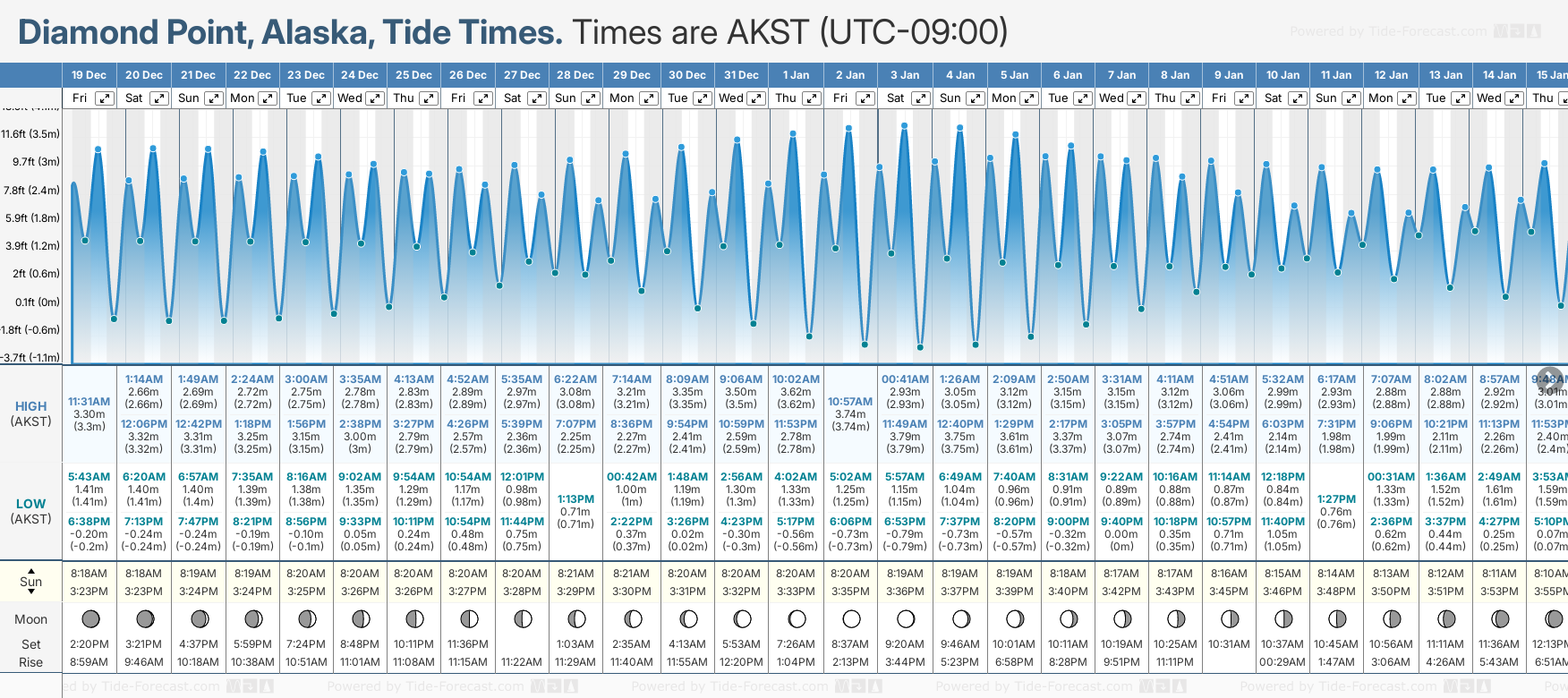 Tide Times are AKST (UTC -9.0hrs). Last Spring High Tide at Diamond Point was on Fri 05 Dec (height: 3.92m 12.9ft). Next high Spring Tide at Diamond Point will be on Sat 20 Dec (height: 3.32m 10.9ft).