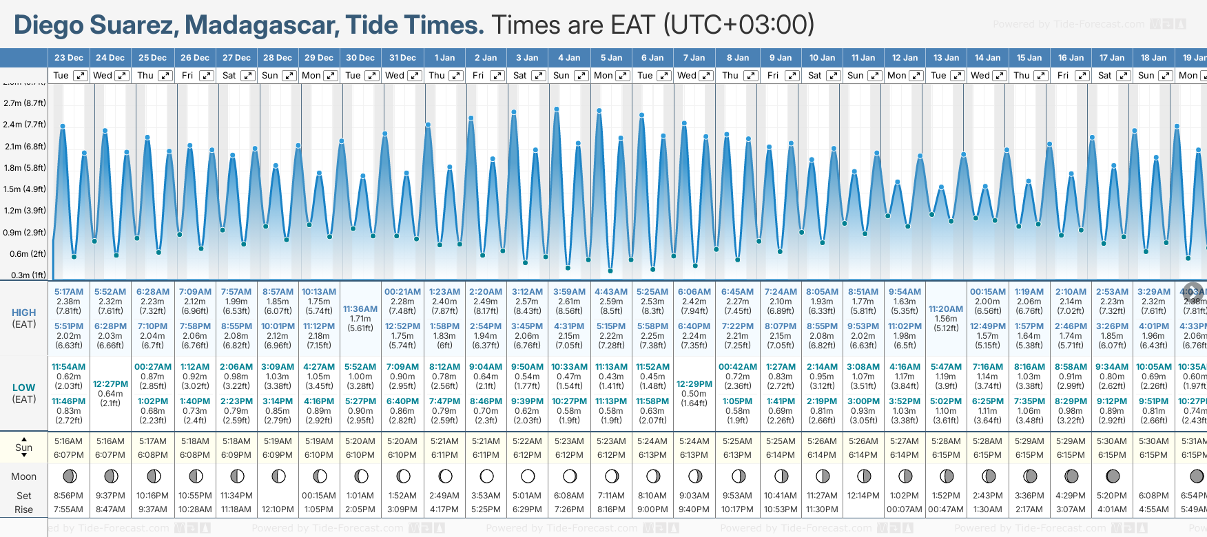 December and January Tide charts for Diego Suarez: The tide charts below show the height, time and date of high and low tides for the next 30 days.