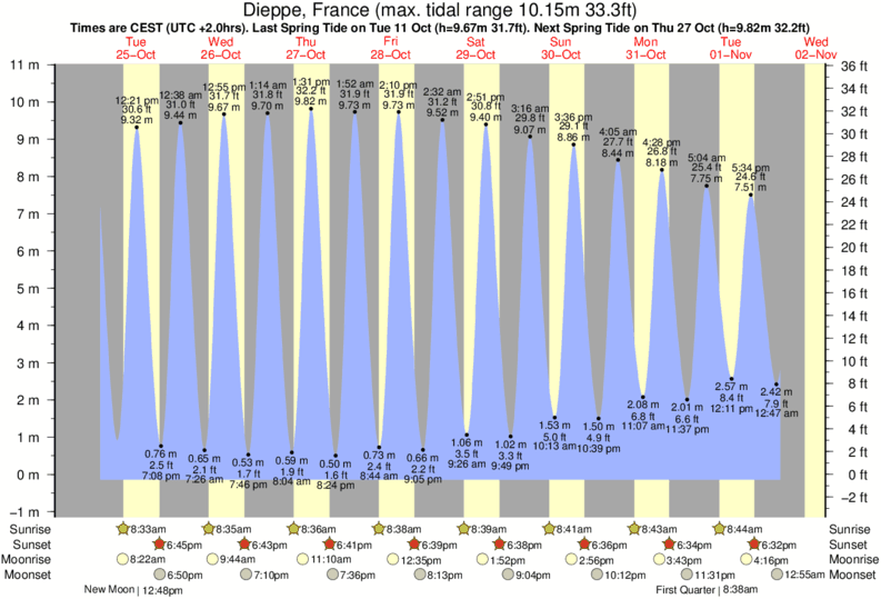 Tide Times are CET (UTC +1.0hrs). Last Spring High Tide at Dieppe was on Sat 06 Dec (height: 9.79m 32.1ft). Next high Spring Tide at Dieppe will be on Mon 22 Dec (height: 8.58m 28.1ft).
