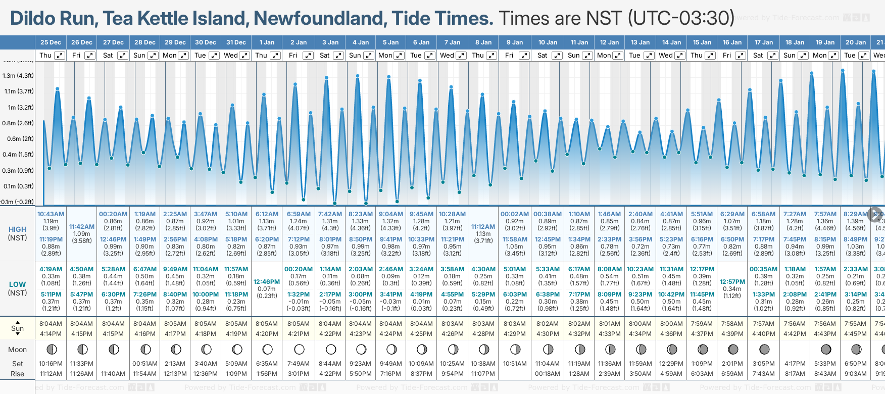 Tide chart for Dildo Run, Tea Kettle IslandShowing low and high tide times for the next 30 days at Dildo Run, Tea Kettle Island. Tide Times are NST (UTC -3.5hrs).