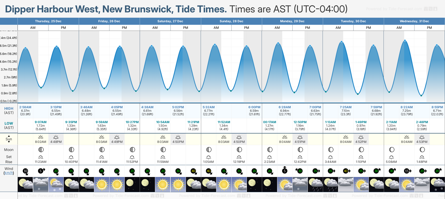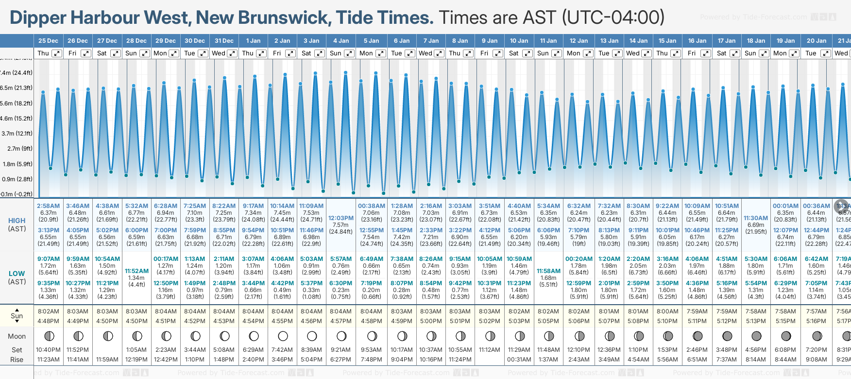 Tide Times are AST (UTC -4.0hrs). Last Spring High Tide at Dipper Harbour West was on Fri 19 Dec (height: 6.69m 21.9ft). Next high Spring Tide at Dipper Harbour West will be on Sun 04 Jan (height: 7.57m 24.8ft).