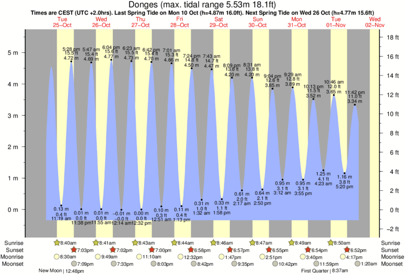 Tide Times are CET (UTC +1.0hrs). Last Spring High Tide at Donges was on Sat 06 Dec (height: 4.73m 15.5ft). Next high Spring Tide at Donges will be on Mon 22 Dec (height: 4.18m 13.7ft).