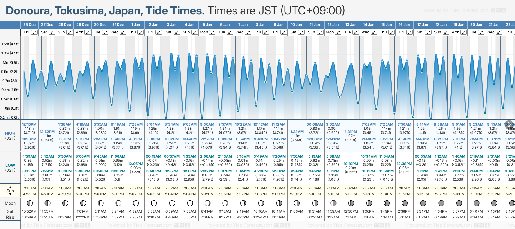 Tide Times are JST (UTC +9.0hrs). Last Spring High Tide at Donoura was on Sat 20 Dec (height: 1.31m 4.3ft). Next high Spring Tide at Donoura will be on Sat 03 Jan (height: 1.28m 4.2ft).