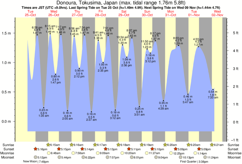 Tide Times are JST (UTC +9.0hrs). Last Spring High Tide at Donoura was on Sun 07 Dec (height: 1.35m 4.4ft). Next high Spring Tide at Donoura will be on Sat 03 Jan (height: 1.28m 4.2ft).