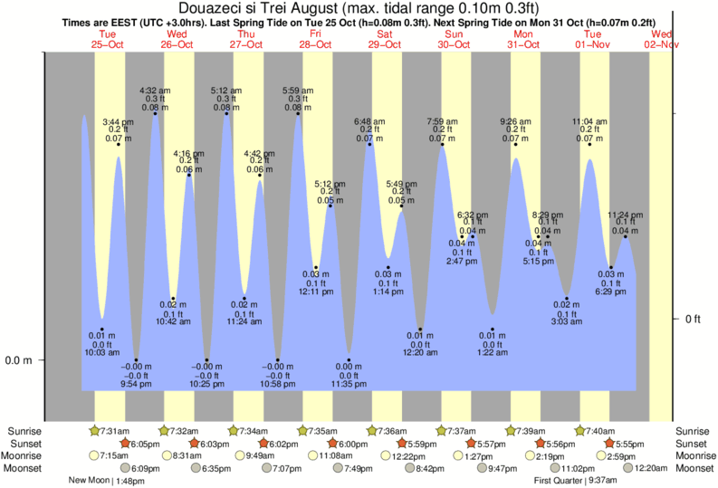 Tide Times are EET (UTC +2.0hrs). Last Spring High Tide at Douazeci si Trei August was on Sat 20 Dec (height: 0.08m 0.3ft). Next high Spring Tide at Douazeci si Trei August will be on Fri 26 Dec (height: 0.07m 0.2ft).
