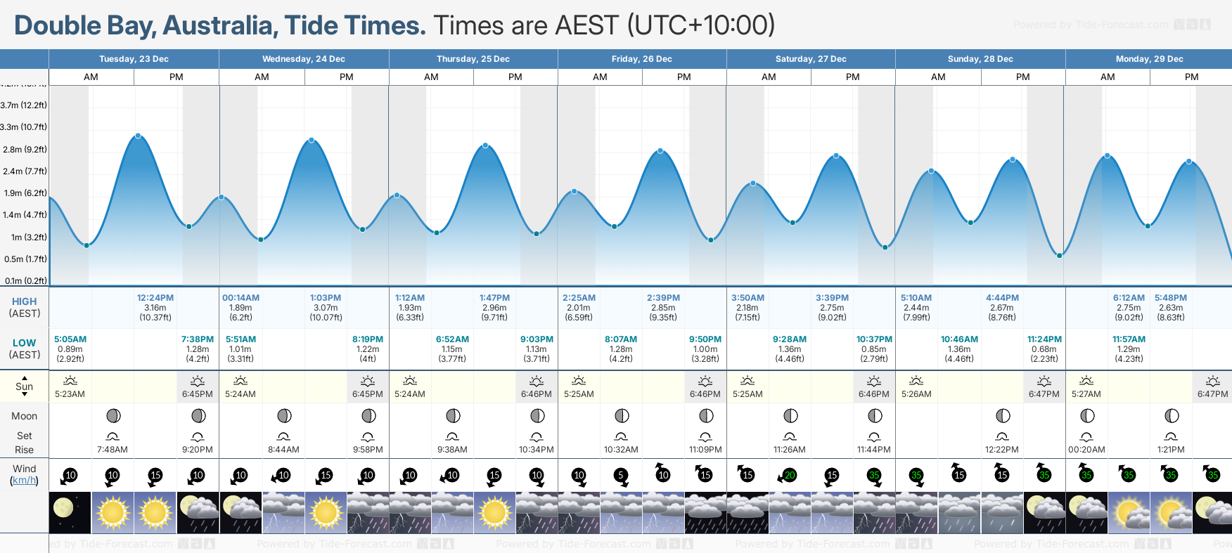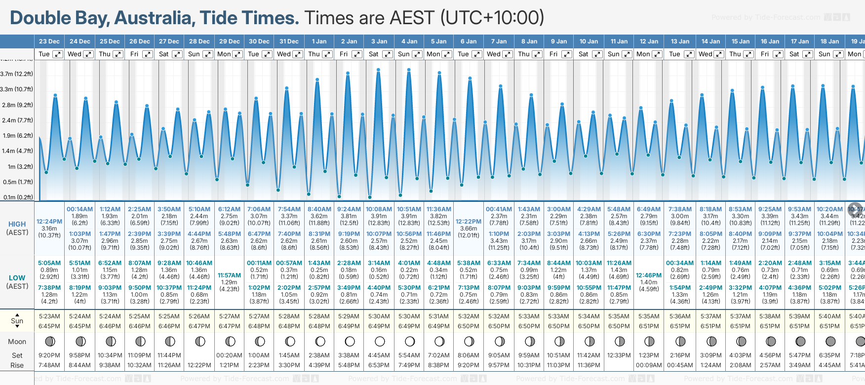 December and January Tide charts for Double Bay: The tide charts below show the height, time and date of high and low tides for the next 30 days.