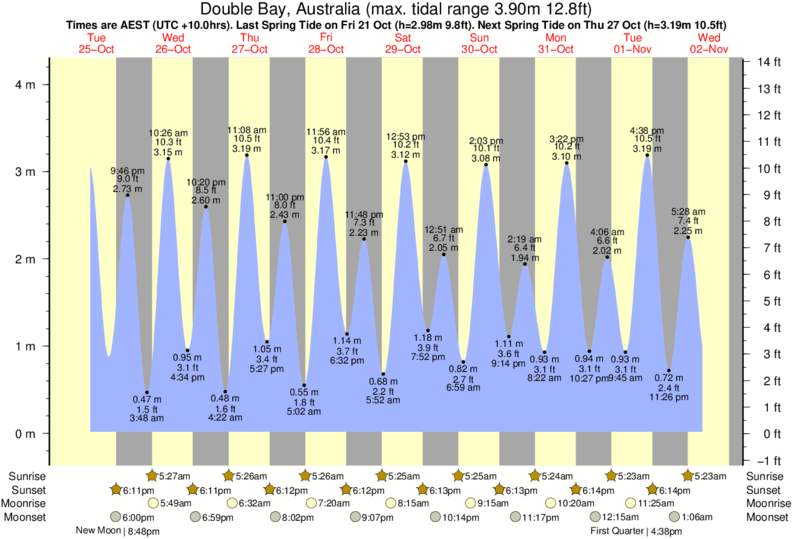 Tide Times are AEST (UTC +10.0hrs). Last Spring High Tide at Double Bay was on Fri 19 Dec (height: 3.33m 10.9ft). Next high Spring Tide at Double Bay will be on Sat 03 Jan (height: 3.91m 12.8ft).