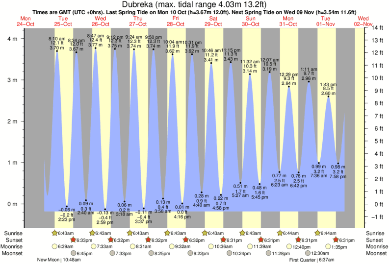 December and January Tide charts for Dubreka: The tide charts below show the height, time and date of high and low tides for the next 30 days.