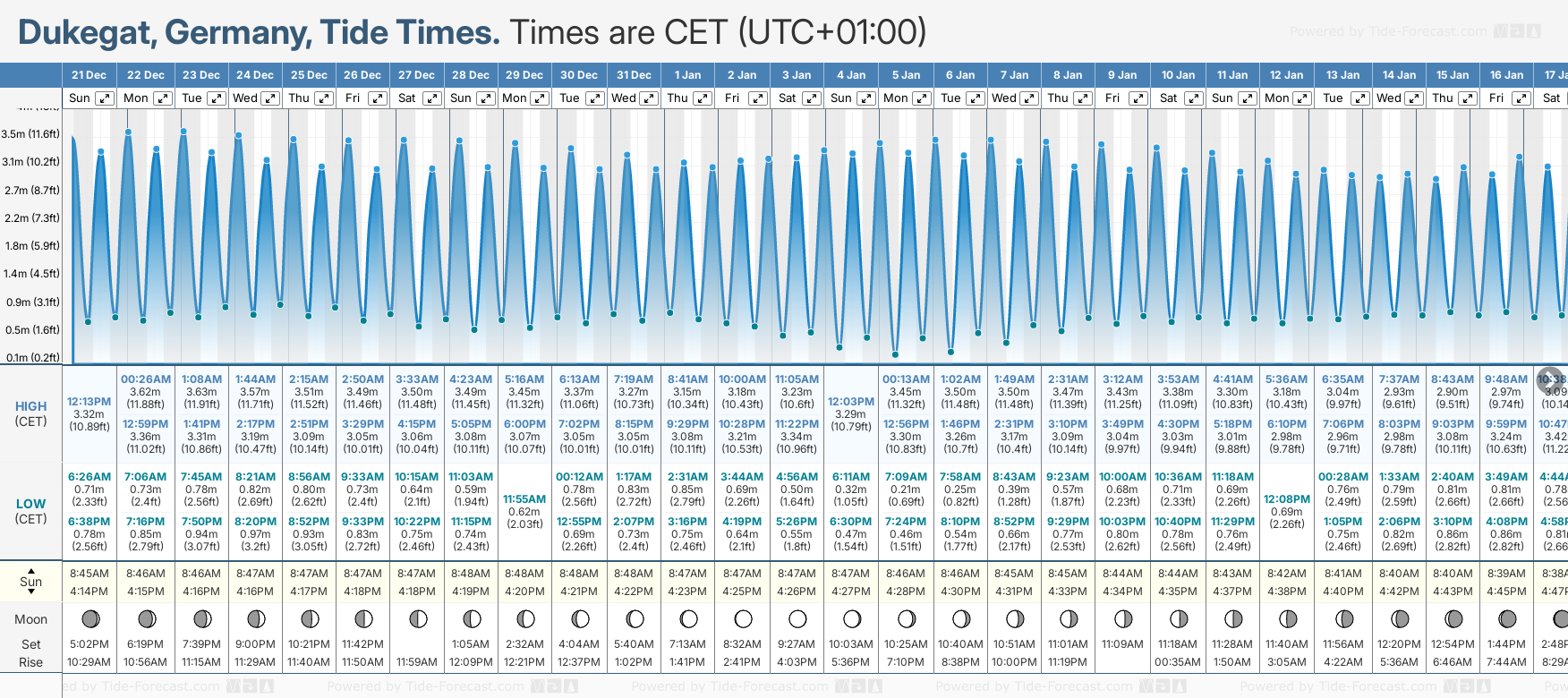 December and January Tide charts for Dukegat: The tide charts below show the height, time and date of high and low tides for the next 30 days.