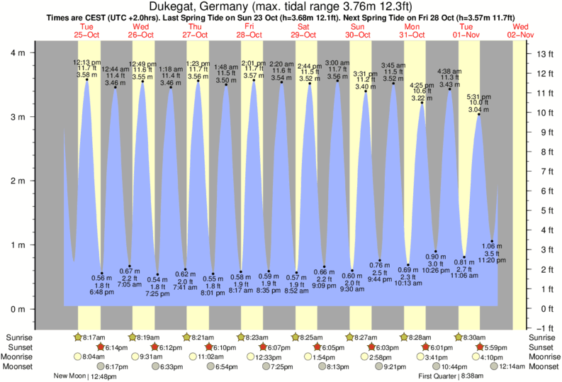 Dukegat tide chart key: The tide chart above shows the height and times of high tide and low tide for Dukegat, Germany. The grey shading corresponds to nighttime hours between sunset and sunrise at Dukegat.