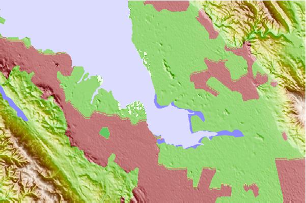 Use this relief map to navigate to tide stations, surf breaks and cities that are in the area of Dumbarton Bridge, San Francisco Bay, California.