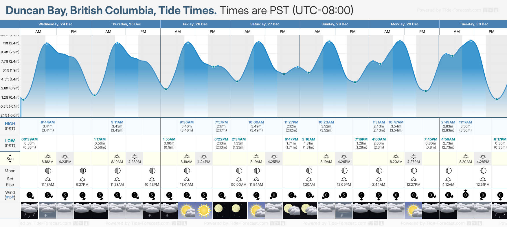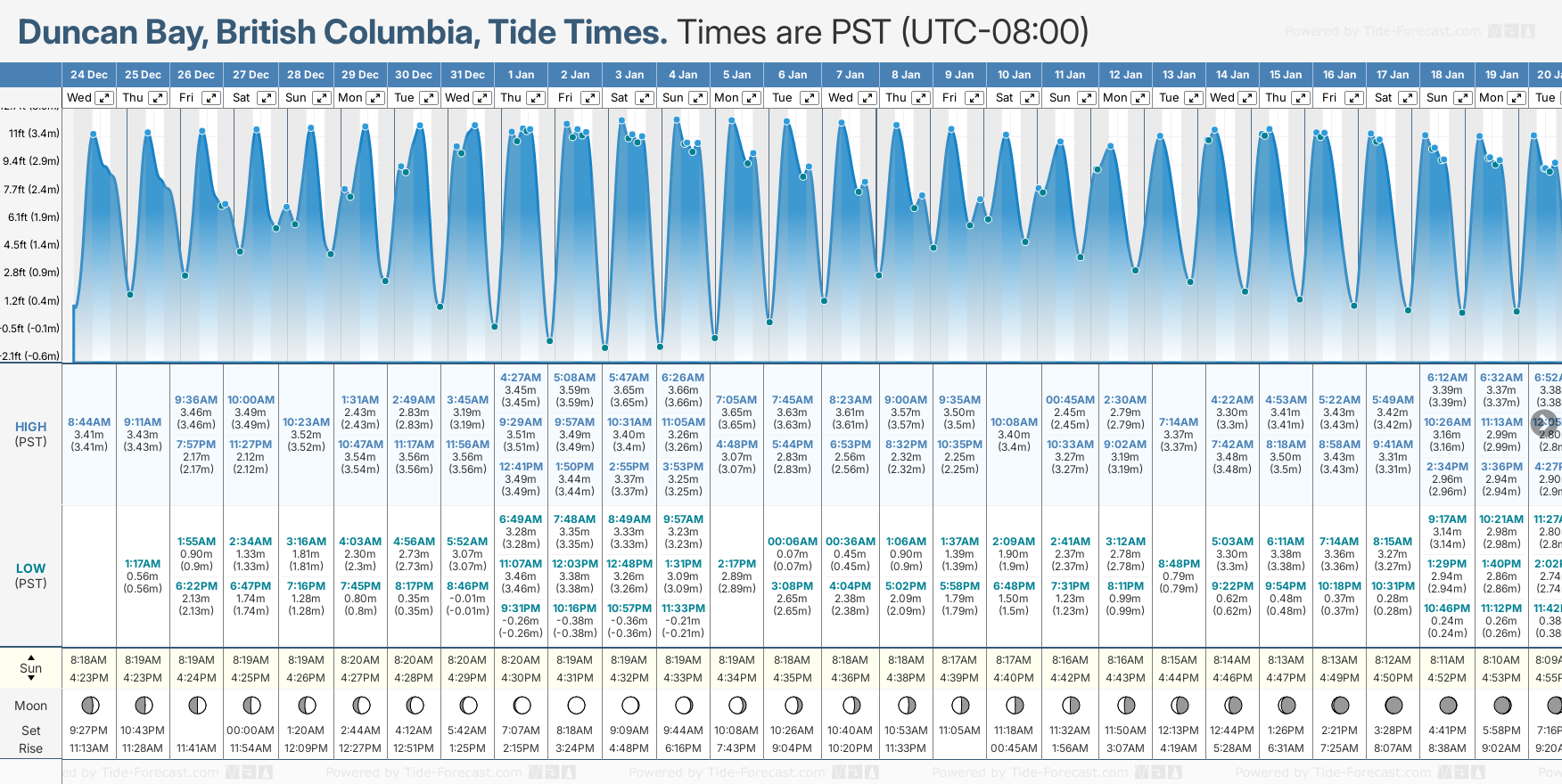 Tide Times are PST (UTC -8.0hrs). Last Spring High Tide at Duncan Bay was on Thu 18 Dec (height: 3.43m 11.3ft). Next high Spring Tide at Duncan Bay will be on Tue 30 Dec (height: 3.56m 11.7ft).