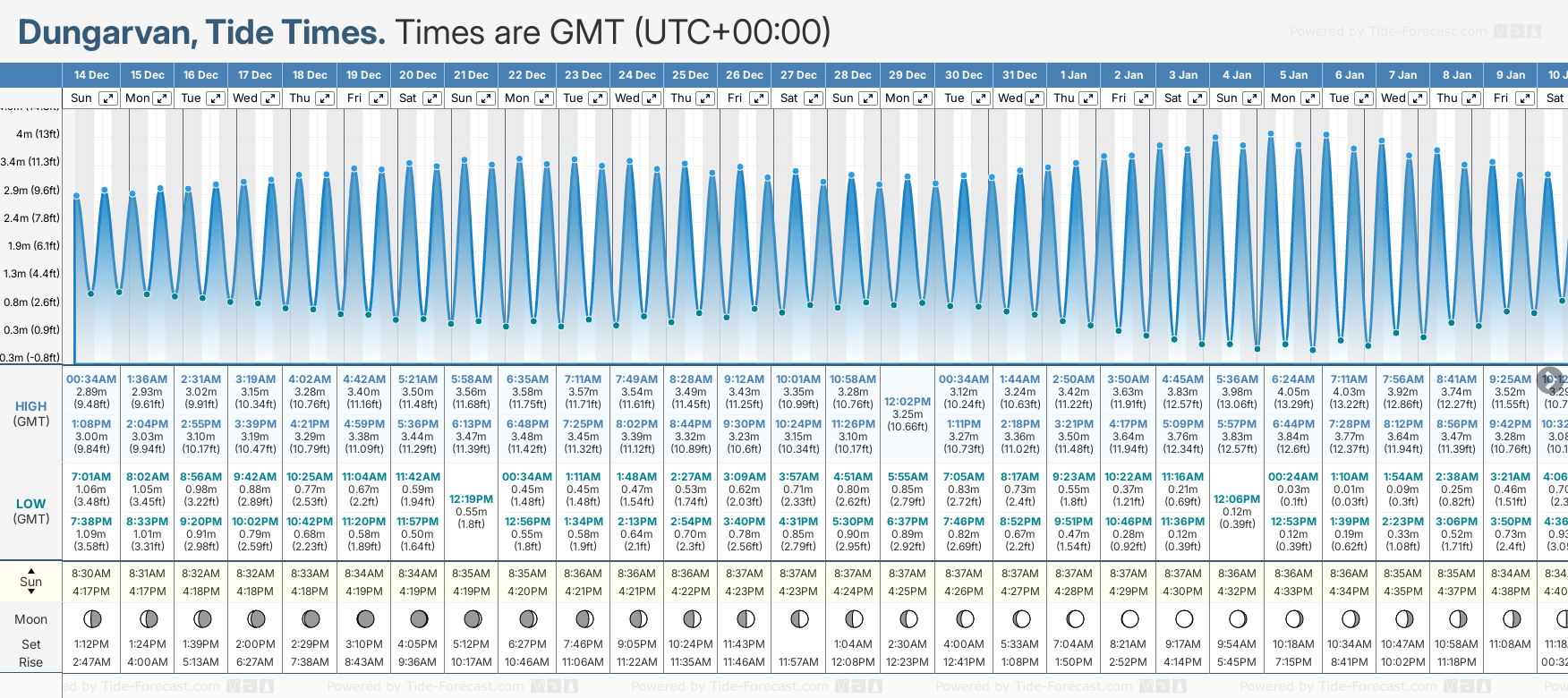 Dungarvan Tide Chart including high and low tide times for the next 7 days