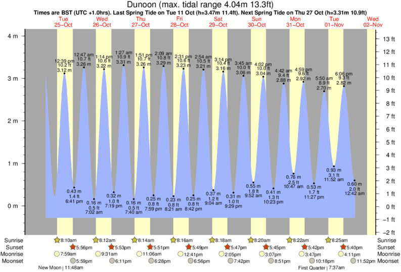December and January Tide charts for Dunoon: The tide charts below show the height, time and date of high and low tides for the next 30 days.