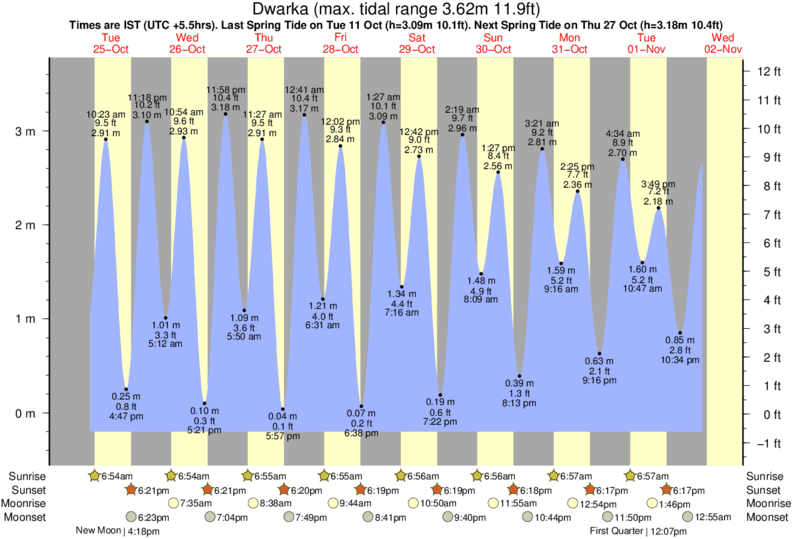 Tide Times are IST (UTC +5.5hrs). Last Spring High Tide at Dwarka was on Sat 06 Dec (height: 3.37m 11.1ft). Next high Spring Tide at Dwarka will be on Mon 22 Dec (height: 3.01m 9.9ft).