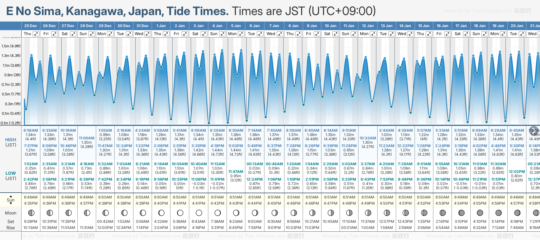 Tide Times are JST (UTC +9.0hrs). Last Spring High Tide at E No Sima was on Mon 22 Dec (height: 1.48m 4.9ft). Next high Spring Tide at E No Sima will be on Mon 05 Jan (height: 1.44m 4.7ft).