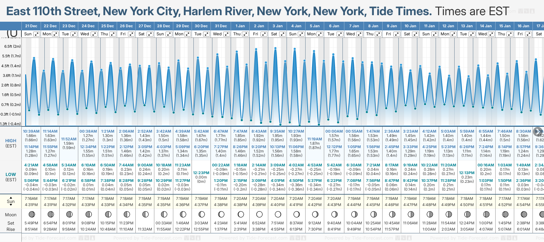 December and January Tide charts for East 110th Street City, Harlem River, New York: The tide charts below show the height, time and date of high and low tides for the next 30 days.